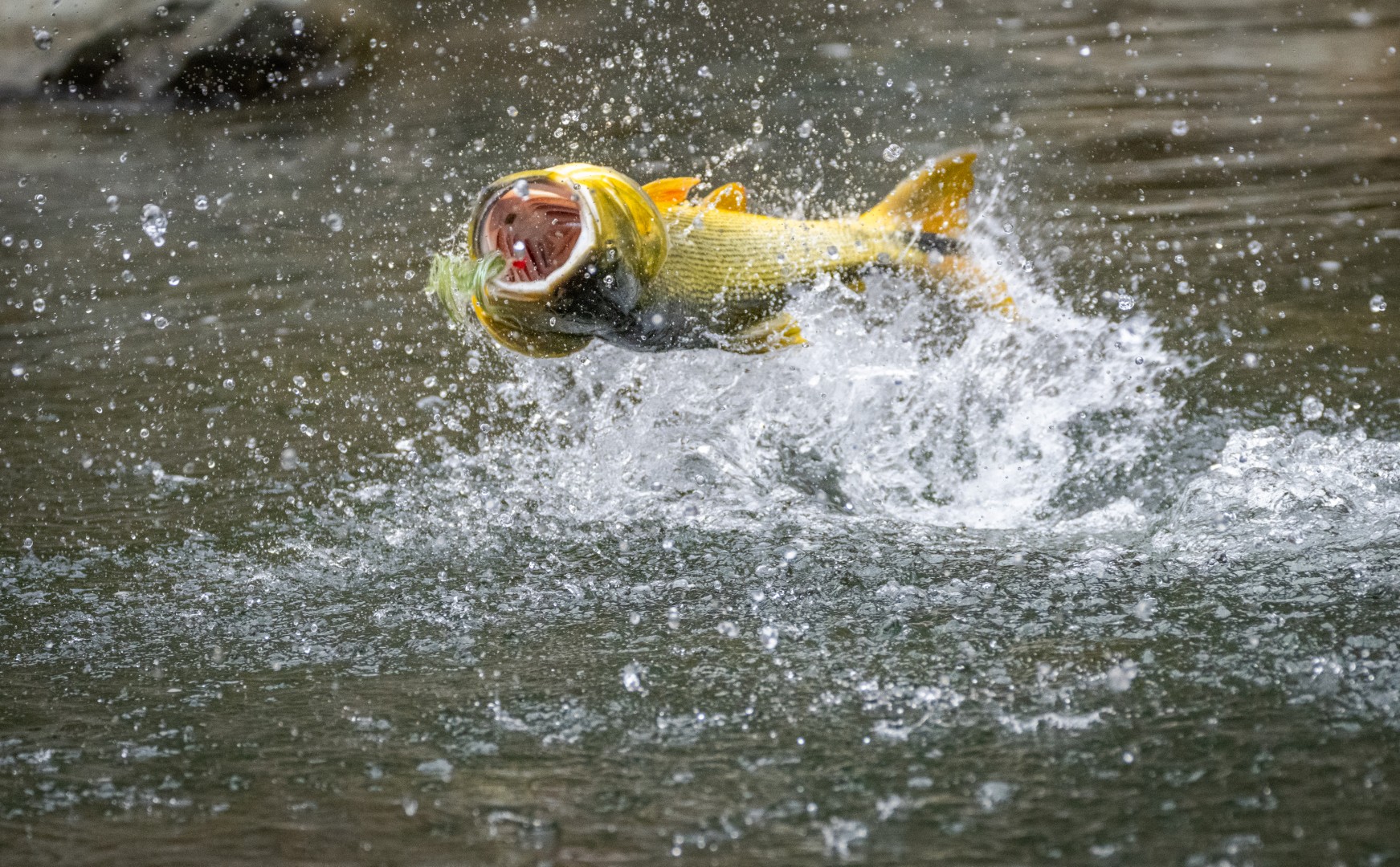 När vi tog oss upp längs med älven kastade vi på vägen. Vi provade att köra ytbeten denna gång. En med en musimitation och en med en popper. Aldrig någonsin har jag strippat så fort i hela mitt liv. Yup i know det låter otroligt roligt när jag skriver det, men det är ju faktiskt så man säger. ”Strippa hem linan”. Vattnet forsade snabbt och det gällde att lyckas hålla så pass mycket kontakt med flugan så man fick den att röra sig. På vissa ställen gick det inte att fiska uppströms som man var rekommenderad, då fick vi fiska i sidled. Det gällde att i princip börja strippa redan innan flugan landat för att man inte skulle ha massor med dötid och att flugan skulle drifta långt innan man kunde börja fiska. Skulle flugan då drifta förbi en dorado och den fick syn på den utan att den rörde sig är risken stor att den skulle kolla på den och tappa intresset direkt. Någonting man självklart inte vill ska hända.