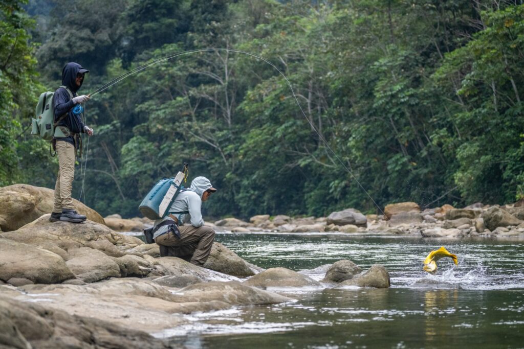 Första timmen var svår, likaså den andra. Hannes var som en iller på stenarna och flög fram medan jag själv var tvungen att ta det lite lugnare, jag ville ju inte ramla och bryta ännu ett ben. Martin såg hur jag började bli på gränsen till frustrerad och tog med mig till ett coolt ställe. Vi lämnade Hannes bakom oss och gick en bit. Ett vattenfall som såg sådär helt perfekt ut där vatten forsade ner vid tre olika platser. Det bara måste stå ett gäng fiskar där, det såg alldeles för bra ut för att det inte skulle stämma. Min svarta musimitation flög genom vinden när jag började skapa energi i fluglinan. Fram och tillbaka med vänsterhanden som drog i linan för att böja till spöet ordentligt för ännu mer kraft. När jag sköt iväg hamnade flugan precis nedanför vattenfallet och jag började strippa direkt. Musen tog sig graciöst hem över ytan och jag såg hur vattnet bakom den reste sig i en millisekund innan den blev inhalerad av en fin guldtacka. Vänsterhanden fördes bakåt och kroken placerades fint i mungipan på fisken. Den sköt upp ovanför ytan och gjorde en liten dans. Glädjetjut och applåder ljöd över den annars tysta djungeln. Stackars djur som befann sig i närheten, de måste blivit livrädda.